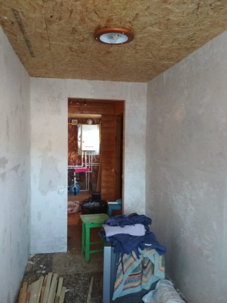 Дом мы купили старенький. Была комната с печкой, шторкой за печкой отгорожена кухонька, неотапливаемая летняя кухня и тераска, и отгороженная большая кладовка в коридоре. Туалет во дворе. За печкой висел умывальник и под раковиной стояло ведро. Мы там не ночевали, поэтому всё устраивало. Сидела я как то в июле в своём саду и мечтала, отпуск пришлось проводить дома. Поехать никуда не получилось, а деньги были отложены. И подумалось мне, может провести газ? Призвала родственников, стали думать, если подводить газ, надо утеплять холодную половину дома, подводить воду. Если подвести воду, надо канализацию... И понеслось... Делали всё сами, слава богу брат всё умеет и сына моего научил. А папа, я и младший сын на подхвате. Вначале взялись за холодную пристройку, утеплили стены мин ватой и обшили OSB. Вскрыли полы, сделали черновые и утеплили. Подняли выше потолок. Получилось два помещения- котельная и маленькая комната. Вставили пластиковые окна. От колодца прокопали траншею 1.20м глубино