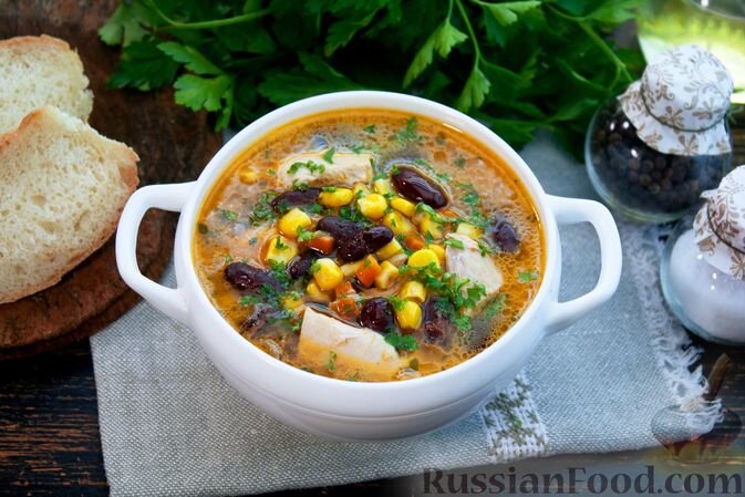 Острый суп со сливками, кукурузой и фасолью. Сырный суп с жареной вермишелью. Суп с пельменями и яйцом. Суп с куриными потрошками, копчёной грудинкой, чечевицей и горошком. Постный рассольник с маслинами и черносливом. Гречневый суп с беконом и консервированной фасолью. Картофельный суп-пюре с беконом и черносливом. Сырный суп с жареной вермишелью – простейшее, интересное и очень быстрое в приготовлении первое блюдо из моркови, плавленого сыра и вермишели. Особенность этого рецепта в том, что вермишель для супа предварительно обжаривается, что влияет на вкус лучшим образом. Приятную сливочность даёт плавленый сыр, а хрустящие сухарики удачно дополняют суп. Необычный суп с пельменями и яйцом, а также с помидорами, добавленными в овощную зажарку, получается насыщенным, вкусным и сытным. Часть отварного картофеля разминается в пюре и вместе с измельчёнными отварными яйцами придает супу густоту. Суп с куриными потрошками, копчёной грудинкой, капустой, чечевицей и горошком – также оригинал