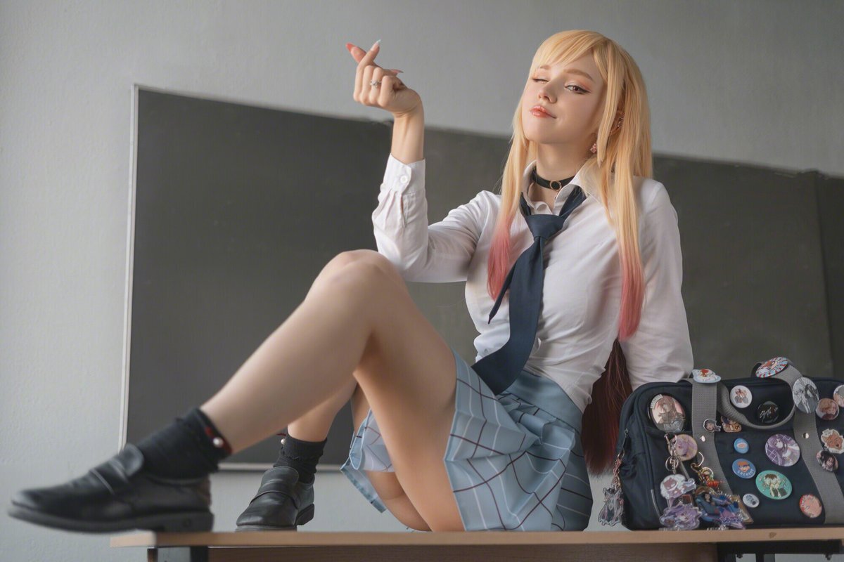 Марин Китагава персонаж из аниме "Эта фарфоровая кукла влюбилась". Как по мне, обычное аниме с сюжетом на сюжет. Не могу понять, что мне именно понравилось в этом аниме, наверно рисовка, и сама Марин. Гг обычный стесняшка, который не способен смотреть на девочку в купальнике, но и у него есть плюсы, например на него всегда можно положится, вышивать умеет и учится неплохо. Актриса Саша Холланд для косплея выбрала повседневный образ персонажа из белой рубашки, галстука и голубой юбки. Модель воссоздала светлые полосы Марин с розовыми кончиками и большое количество серёжек в ухе.