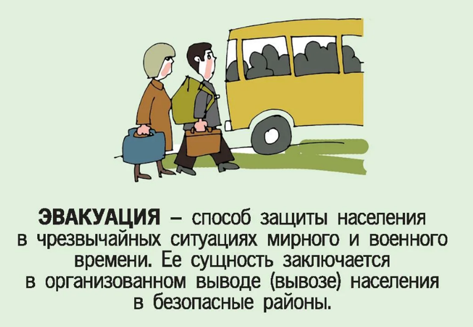 Эвакуация заключается в организованном выводе (вывозе) населения из крупных городов, других населенных пунктов и размещение его в безопасных районах, а также выводе (вывозе) населения из зон возможного катастрофического затопления, землетрясения, районов, которым угрожают селевые потоки, снежные заносы, крупные пожары и другие стихийные бедствия. О начале эвакуации населению объявляет местная администрация органов самоуправления. Порядок эвакуация и действия населения при этом, мы обсудим позже.