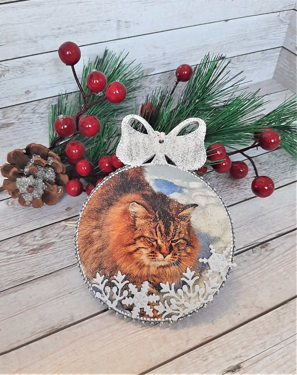 Услышала немало удивленных вопросов о том, как же я, заядлая кошатница, пропустила символ года Котика! А ведь и правда, в моей рукодельной ленте одни зайцы... Кроме Кота Бегемота на вечном календаре ( МК …). Срочно исправляюсь! Предлагаю сотворить небольшой сувенирчик-подвеску с котиком. Как всегда, быстро и несложно, присоединяйтесь! Понадобится: деревянная заготовка шарика, белый картон, картинка из прошлогоднего отрывного календаря, фоамиран 2 мм, акриловые краски, лак и контуры, глиттер, клей ПВА и Момент прозрачный, лента со стразами. Вырезаем окружности по размеру заготовки - из картона и мотив из странички календаря: Котика клеим на белый круг, затем приклеиваем эту заготовку, так, чтобы сквозь узор на обратной стороне просвечивал белый фон. После этого красим заднюю часть серебряной краской: Бант — белым акрилом: Далее для декора потребуется отрез ленты со стразами и снежинки, вырезанные из фоамирана: По окружности приклеиваем ленточку: Из снежинок выкладываем композицию на обе
