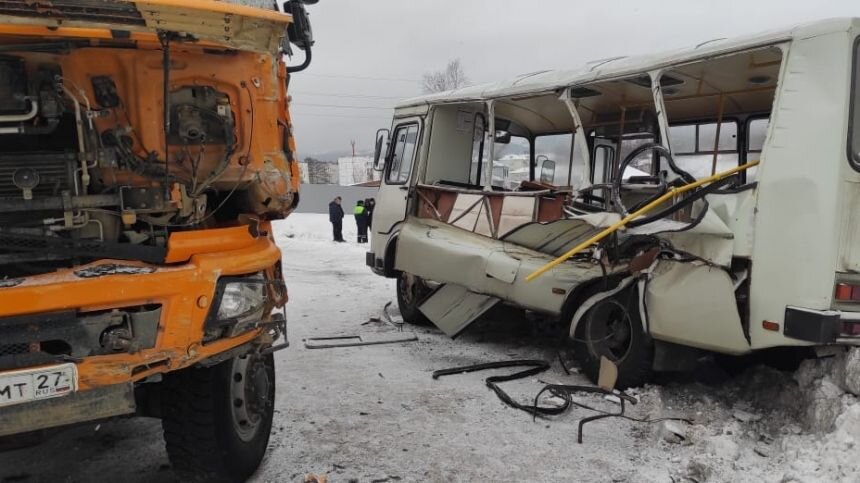 Пассажиров с различными травмами отвезли в больницу. Фото: ГУ МВД по Хабаровскому краю; 5-tv.ru Пассажирский автобус столкнулся с грузовиком в Хабаровском крае. Как стало известно 5-tv.ru, пострадали девять человек. По предварительной информации, ДТП произошло в Советской Гавани. Там столкнулись рейсовый автобус № 3 и грузовик. Все девять пострадавших доставлены в больницу с различными травмами. Обстоятельства дорожной аварии сейчас уточняются. Минувшим днем 5-tv.ru сообщал, что автобус с детьми врезался в грузовик под Новосибирском. Многотонную машину от удара унесло в кювет.