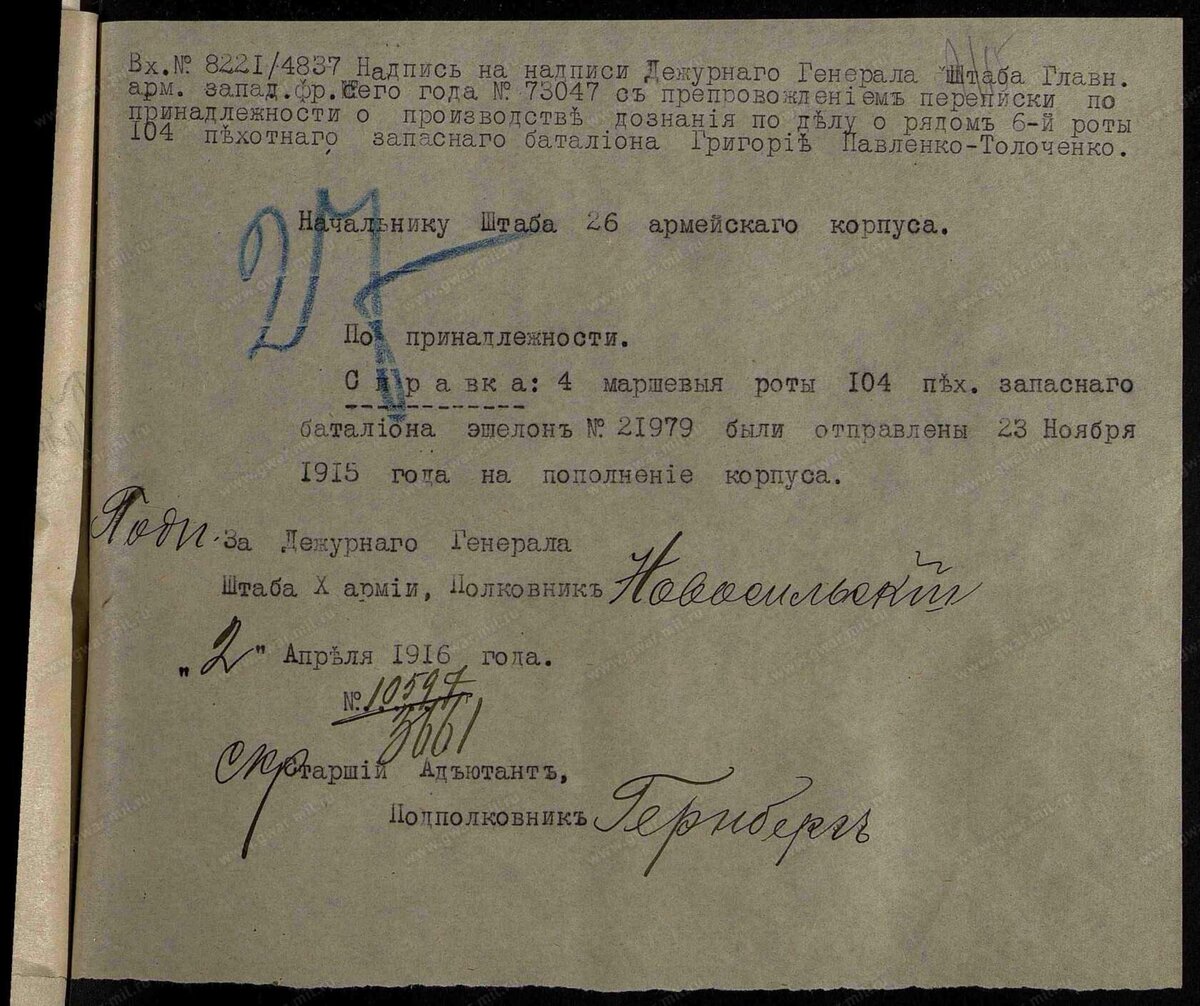 8-го января 1916 года Дежурный Генерал Штаба 10-й армии полковник Новожильский сообщил Начальнику Штаба 26-го армейского корпуса, что «4 роты 104-го пехотного запасного батальона эшелон № 21797 были направлены на пополнение 26 армейского корпуса» .