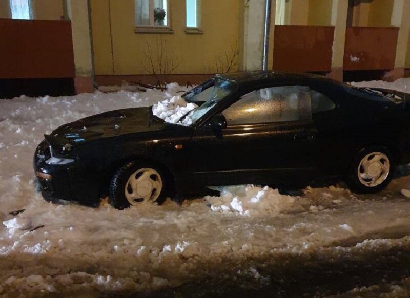 По его словам, он проезжал на своей Toyota Celica мимо многоэтажного дома, и в какой-то момент на него неожиданно, вероятно, с крыши, упала куча снега.