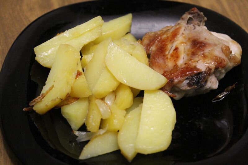 Через 10-15 минут после начала приготовления бедрышек крышку убрал, прибавил нагрев и обжарил до румяной корочки.