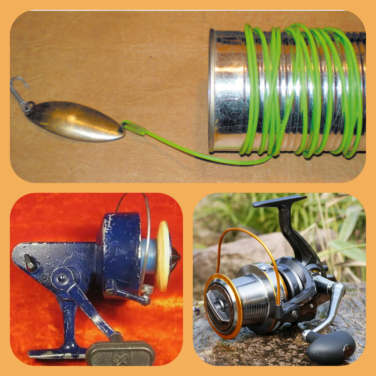 Хочу показать как эволюционировала катушка для спиннинга немного так юмористический. Эволюция без инерционной катушки Мы видим что самая простая без инерционныонная катушка это консервная банка, потом представлена катушка советских времён и следующая современная катушка. Следующая катушка это инерционная катушка Сдесь мы видим катушку сделанную из катушки из под ниток, следующая это советская Невская катушка и современная мультипликаторная катушка. А вот на такие катушки ловят продвинутые рыбаки😂 А вы какими ловите катушками?