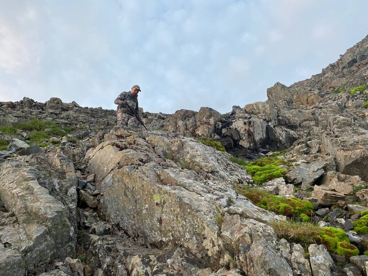 Вечерело. Мы ещё не дошли до предполагаемого места разбивки лагеря, как в бинокль обнаружили снежного барана, отходившего от солонца. Расстояние до зверя составляло около километра, но даже на такой дистанции были видны его рога, сделавшие как минимум полный оборот, что подтверждало выдающиеся трофейные качества зверя. К сожалению, начинало темнеть. Решили скинуть рюкзаки и подходить налегке. Между бараном и нами находился невысокий гребень, так что были все шансы остаться незамеченными. Подбежав к вершине, за которой баран скрылся из виду, обнаружили его пасущимся внизу. Зверь постоянно перемещался, и сделать прицельный выстрел с расстояния более 600 метров было очень сложно. Тем более что темнело буквально на глазах. Сделали все необходимые измерения – дистанции, скорости ветра, – сверили всё с калькулятором, и приняли решение стрелять.
