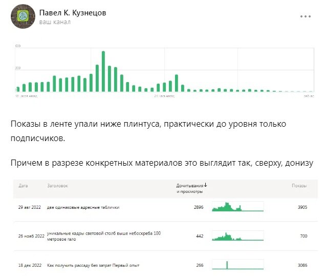 У вас показы упали? А предупреждения на старых материалах появились? Когда показы посыпались у меня, я связал это с изменением показов в ленте Даже статью написал, размышления по этому поводу На всякий случай обратился в ТП и получил ответ Еще писал им убеждал что что-то не то происходит, но они упрямо указывали, всё в порядке, просто выкладывать вы меньше стали, ролики в карусели не все смотреть умеют и бла-бла-бла. Ну может быть, тем более обнаружил что с компа, при открытии Яндекса больше в Дзен не попадаю. Но переписка, когда типа всё хорошо произошла 20 декабря, а утром 23-го, то бишь сегодня Презумция виновности Появилось предупреждение. Причем сначала их было 2, но второе я не успел увидеть, исчезло. Припомнились мне и комментарии друзей с похожими проблемами на их каналах и пазл сложился. Каналы проверяют массово и при малейшем поводе пессимизируют. Но на эти проверки нужны ресурсы. А их как всегда впритык. Поэтому применяется презумция виновности, то есть канал сначала песси