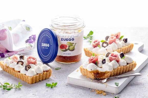 - На остывшую основу нанесите тонкий слой инжирного конфитюра Zuegg, сверху выложите пряный крем из рикотты.