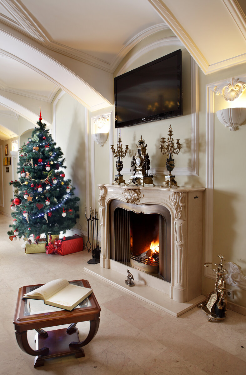 Рождество и Новый год традиционно вызывают ассоциации с семейным торжеством и уютом, и камину в зимние праздники отводится одна из главных ролей, так как этот элемент интерьера давно стал символом тепла и душевной атмосферы. Не смотря на то, что тренд на использование каминов в интерьерах с каждым годов увеличивается, украшению каминной зоны не придают должного значения, а ведь это смысловой центр помещения. В декорировании камина необходимо учесть несколько важных вещей. Первая, это соблюдение правил пожарной безопасности. Нельзя располагать в непосредственной близости от открытого огня ветки деревьев, бумажный и тканевый декор. Гармонично будут выглядеть украшения, соответствующие общей концепции интерьера. Традиционные цвета новогодних праздников, белый, красный, зеленый, синий можно разбавлять и другими цветами, которые вам нравятся, но лучше не использовать больше трех цветов. Сочетая цвета, следует помнить простое правило: теплые тона нельзя смешивать с холодными. Полка над камин