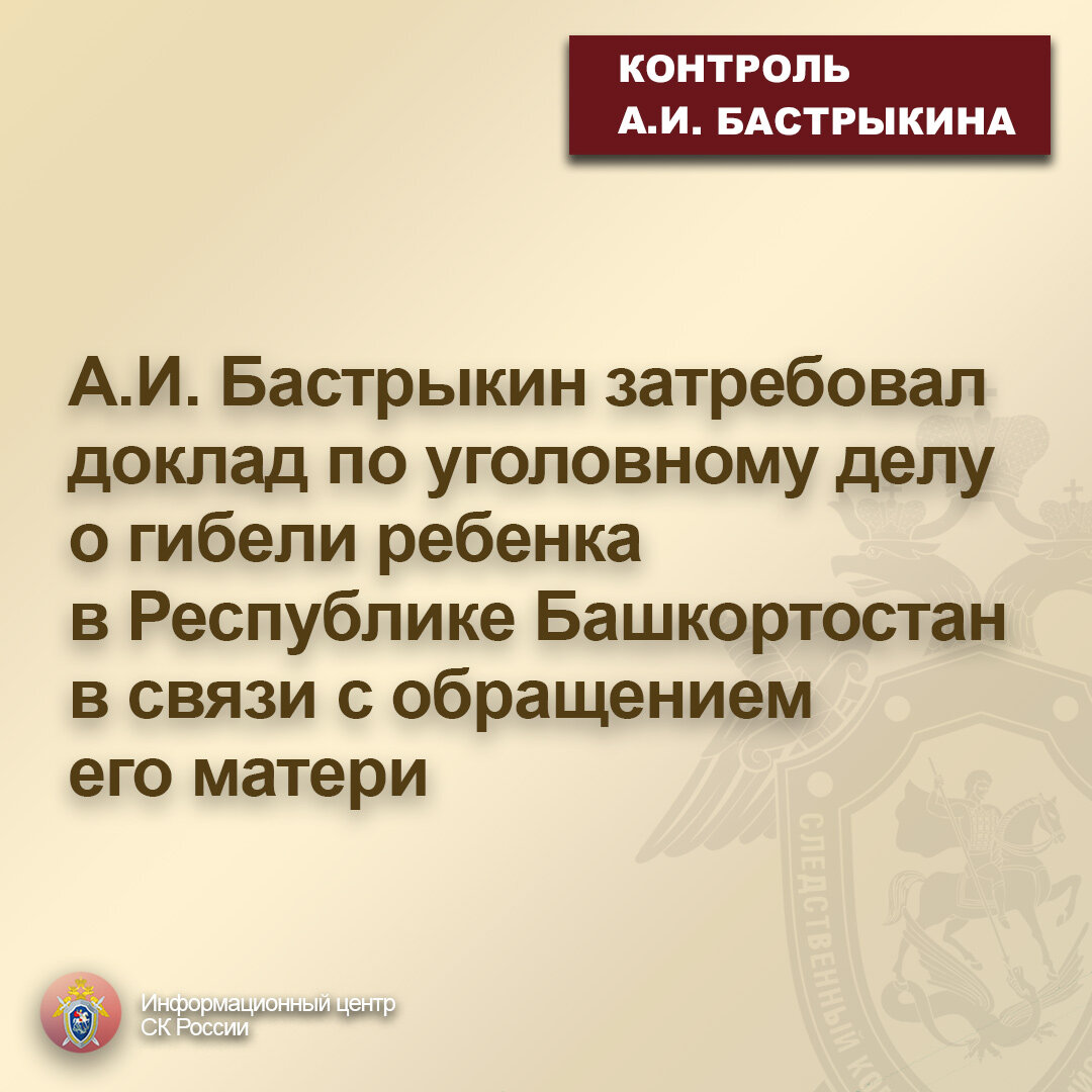 А.И. Бастрыкин затребовал доклад по уголовному делу о гибели ребенка в Республике Башкортостан в связи с обращением его матери