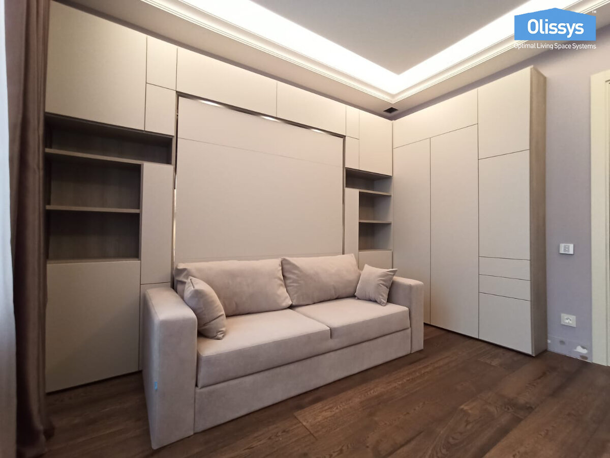 В данной статье хотим рассказать об очень удачном решении меблировки небольшой комнаты в стандартной российской многоэтажке. Дизайнеры Olissys, вместе с заказчиком создали и реализовали проект, который удовлетворяет самым высоким требованиям в плане дизайна, функциональности и эффективного использования пространства. Комнату предполагалось использовать как спальню, гостиную и рабочий кабинет. Кроме этого была необходимость заложить в проект много места для хранения вещей. Было принято решение вдоль одной стены разместить большой модуль-трансформер Olissys с диваном и угловой системой хранения, которую установили к стене с входной дверью. Получился уютный уголок с мягкой мебелью, открытыми и закрытыми полками. В вечернее время гостиная превращается в спальню с широкой удобной кроватью. В изголовье спального места есть небольшие ниши, точечные светильники и беспроводные зарядные устройства. В качестве дополнительной опции добавили каретную стяжку. Вдоль противоположной стены разметили ту
