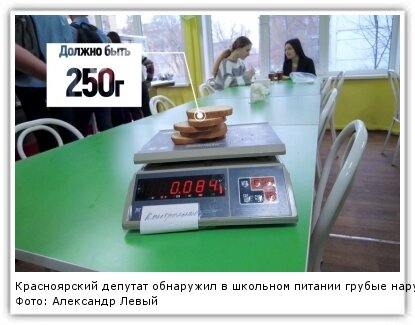 Депутат Красноярского городского совета Александр Левый проверил школьные столовые и столкнулся с многочисленными нарушениями. Депутат посетил 7 красноярских школ и во всех обнаружил недовесы. Самые значительные несоответствия были у оператора питания ООО "Кулинар". Так, на проверке в одной из школ все три продукта, входящие в завтрак, не соответствовали заявленному в меню весу. Взвешивали 5 порций, которые уже были накрыты детям. Картофель весил 763 грамма, когда должен быть 1150 грамм. Огурец 72 грамма вместо 150 грамм. Батон с йодом 84 грамма вместо 250 грамм. На каждого ребенка здесь не доложили продуктов на 36 рублей. Завтрак едят 600 детей. Получается 21 600 рублей недовеса только за один прием пищи. ООО "Кулинар" обслуживает 17 школ. Если такие недовесы там везде, сумма за один прием пищи может доходить до 350 тысяч. Другое нарушение было обнаружено в пищеблоке школы № 19. Там заменили меню без оформления соответствующих документов. Цикличное меню составляется, исходя из санитар