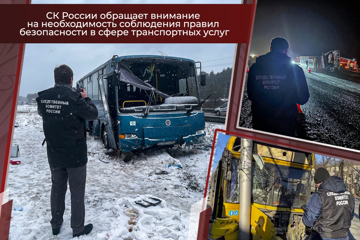 Следователями СК России проводятся проверки и расследуются уголовные дела по фактам травмирования или гибели граждан в результате оказываемых услуг по перевозке и нарушений Правил дорожного движения. Так, 23 декабря 2022 года в ходе движения по автодороге Ванино-Советская Гавань в Хабаровском крае пассажирский автобус попал в дорожно-транспортное происшествие. 22 декабря 2022 года на участке автодороги в Искитимском районе Новосибирской области произошло дорожно-транспортное происшествие с участием рейсового автобуса и грузового автомобиля. В результате происшествия пят