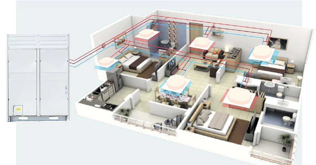 Поскольку внутренний блок охлаждает влажный воздух, часть влаги из воздуха конденсируется и удаляется из блока через дренаж. Следовательно, часть энергии холода неизбежно тратится на конденсацию влаги (скрытая теплота). Теоретически, можно посчитать только явные теплоизбытки в помещении и попытаться подобрать внутренний блок по явной производительности. Но вот в чём проблема: задать и поддерживать относительную влажность воздуха в помещениях с помощью VRF-систем невозможно (да и нет необходимости), поэтому фактически посчитать явную производительность блока также невозможно, поскольку мы не знаем относительной влажности в помещении.