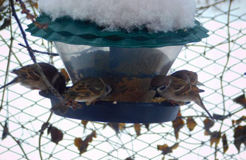 Таяние снега и дождь со снегом с небес не мешают птицам посещать столовки в моём саду. Причем, часы работы у них расписаны четко. Первыми прилетают синицы. Ближе к полудню их место занимают воробьи. И так шустрые воробьишки голодны, что буквально атакуют кормушки, усаживаясь не несколько человек птиц за один стол. Едят неряшливо, сбрасывая часть корма на землю. А на земле столуются те, которым не хватило места у кормушки: Вчера синицы и воробьи опустошили кормушки под чистую. Утром самая первая синица сердито стала долбить в оконное стекло: где еда? Набросила куртку и пошла засыпать очередную партию еды — дроблёную пшеницу, крошки батона, семечки и остатки геркулеса. Обнаружила, что заканчивается и жировая подкормка, правда, в тепло синицы не очень-то её и едят, так что время повесить новую есть.