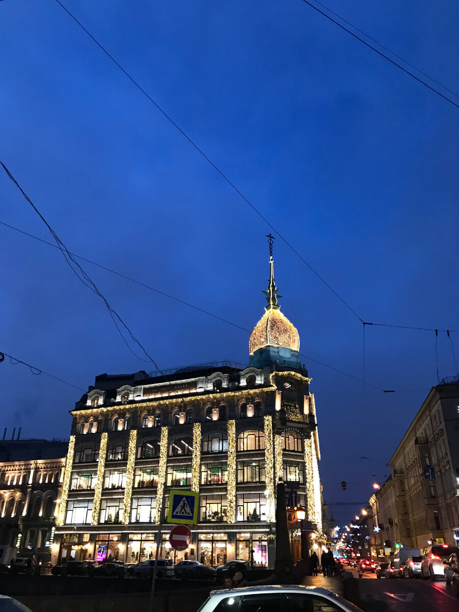 Мой сегодняшний путь пролегал по Гороховой и я была этому очень рада, потому что был случай увидеться. Увидеться с моим любимым зданием: Эсдерс и Схейфальс. В ранних зимних сумерках он смотрится прекрасно, украшенный новогодними огоньками. В темноте не виден шпиль, но мы с вами знаем, что он украшен Кадуцеем. Точнее, шпиль и есть огромный-преогромный… Жезл! Бога Гермеса. Или Меркурия, как хотите. Но я считаю, Гермеса, просто потому что мифы написаны про него. По-русски, Эрмий, к стати… Еремей или Ерёма. В общем, с детства знакомый. У Гермеса было много всяких занятий. Он и посланник богов и проводник душ в загробный мир и бог торговли, покровитель путешественников, глашатаев, послов… миротворец. Бог воров, к стати.!За это, за воровство, он и получил Кадуцей от Аполлона. Хотя он тогда и Кадуцеем-то не был. Они, вообще, братья с Аполлоном. По отцу. Зевсовичи😉. Но с разницей в годах. Когда малыш Гермес только появился на свет, Аполлон был уже взрослый и пас стада. Имел их, лучше та