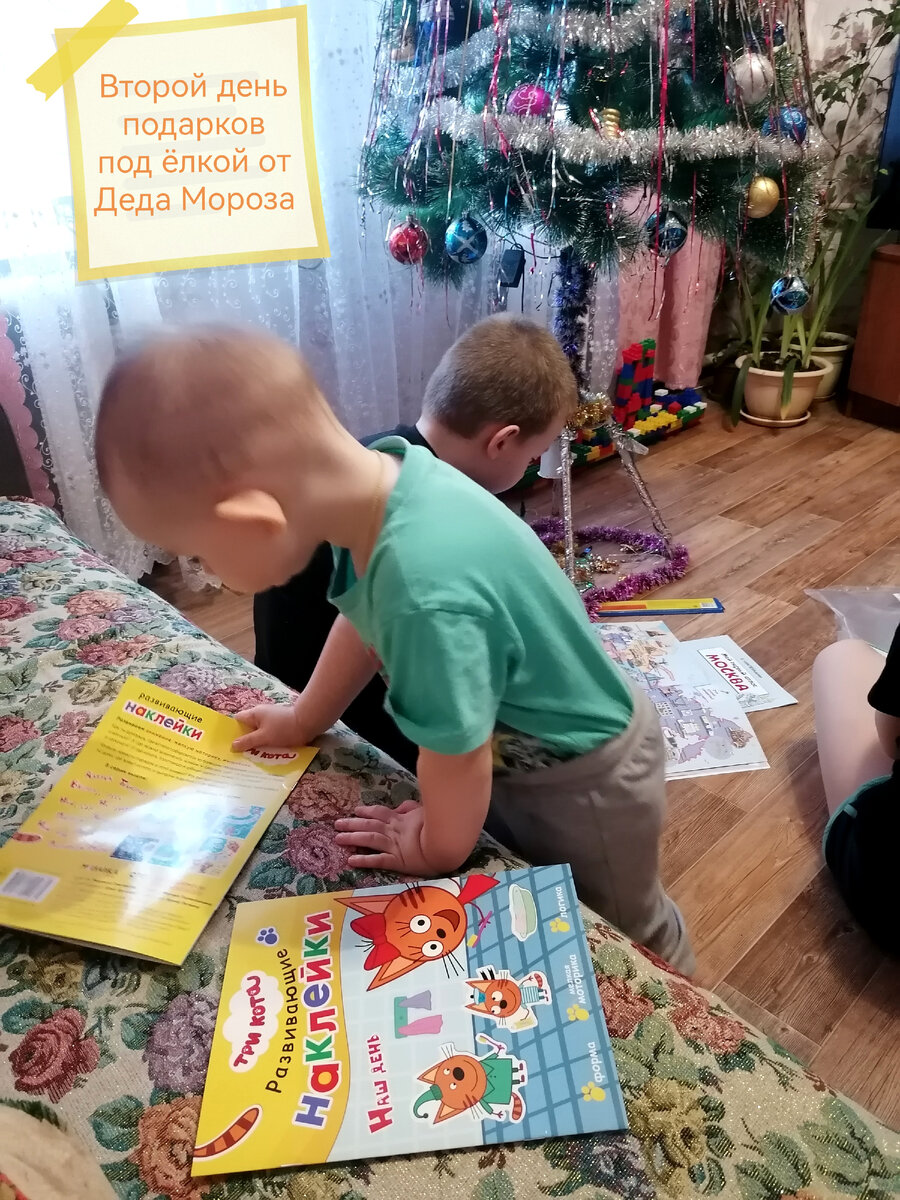 Друзья, а у вас есть семейные традиции на новый год? В нашей семье с появлением племянников возродилась семейная новогодняя традиция из моего детства🤗✨ Моя мама ставит дома всегда ёлку🌲 и дедушка Мороз🎅приносит под неё подарочки🎁 на протяжении нескольких дней🎄🎆 Племянникам сейчас 7 и 9 лет, они, конечно, знают уже, откуда берутся подарки под ёлкой. Но всё равно ждут этих подарков и заранее спрашивают: "А придёт ли дедушка Мороз в этом году?". В этом году мы с Лизой приехали погостить в деревню перед новым годом. Лиза ещё такая маленькая крошка (полные 1,5 года), но уже понимает, что некий дедушка Мороз кладёт детям подарки под ёлки. И после фразы: "Дети, сходите и посмотрите под ёлку, так как мне кажется заходил Дед Мороз!" - Лиза семенит к ёлке😉 В этом году Дедушка мороз целых 5 дней будет оставлять под ёлочкой небольшие подарочки для 3х детишек: ДЕНЬ 1: Вике/Степе - объёмная аппликация про НГ Лизе - водная раскраска На всех - пачка с светящимся Тату На всех - сладкое ДЕ