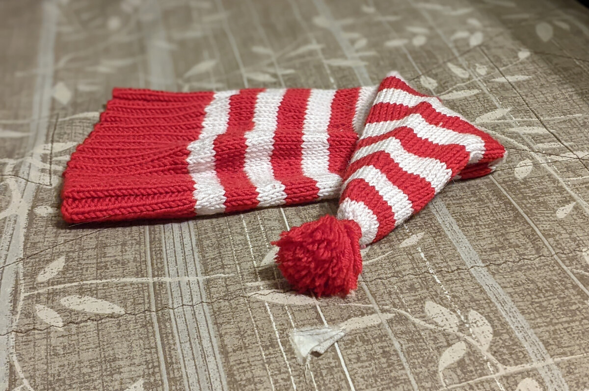 Пряжа Alpina Ornello Merino, 50 г/125м 2 клубка, белый и красный. Спицы круговые 3мм. Набрать красной ниткой 112 петель, вязать резинкой 2х2 20 рядов. Сменить нить на белую, вязать 5 рядов белой нитью, сделать убавки 4 раза по 2 петли вместе в 4 ряду. Все полоски высотой в пять рядов. Дальше красная полоса, сделать убавки 4 раза по 2 петли в первом и 4 ряду. Продолжить этот ритм до 7 полосы ( белой). В 7 полосе и далее вязать вместе 4раза по 2 петли в 4-м ряду. Продолжить чередовать цвет полосок и убавки, я связала 19, последняя полоса белая. Довязала пятый ряд, оборвала нитку и стянула закрытые петли. Осталось пришить красную кисточку и колпачок готов! По размеру подходит мелким деткам около 3-х лет и взрослым с небольшой головой. #детская_шапка, #схема_вязания_детской_шапки, #бесплатная_схема_вязания, #теплые_сказки_шапка