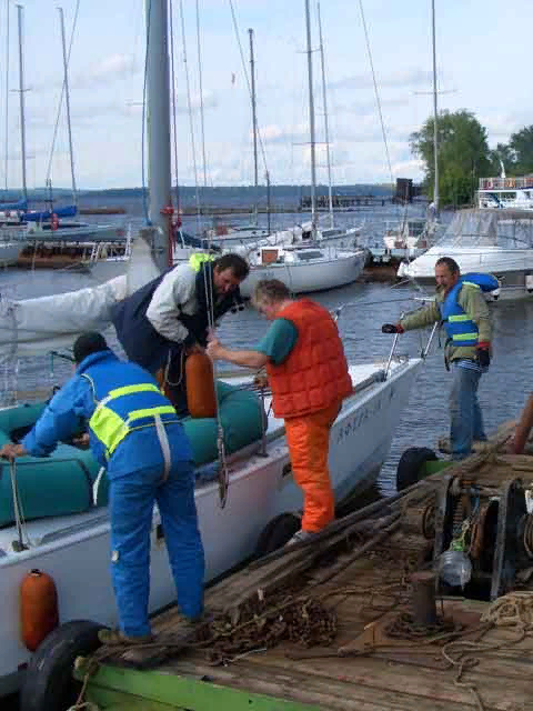 Спуск на воду никак не напоминал праздник. Наши провожающие, не дождавшись его в воскресенье, укатили домой. Участвовали начальник яхт-клуба на кране и мы с Сагитом, зрителей - ни одного. Ринат и Костя отсутствовали, ходили за бензином. Со спуском управились быстро, еще полтора часа - на вооружение лодки, чтение Сагитом инструкции по запуску мотора (сам я до сих пор не удосужился), подъем и спуск грота с одновременным объяснением, что и для чего, и отходим. Первое препятствие - цепь на выходе из клуба. Надо было заранее предупредить сторожей, но мы не подумали. Пока люди на берегу носились за ключами и опускали цепь, я постоял на моторе против ветра. Но наконец, путь свободен, выходим из гавани, люди на пирсе прикладывают руки к головам: салют отважным испытателям яхты! Об испытателях надо сказать следующее: у меня это, говоря авиационным языком, первый самостоятельный полет, Костя (старпом) и Сагит с Ринатом (матросы) на нерезиновом судне вообще впервые.
