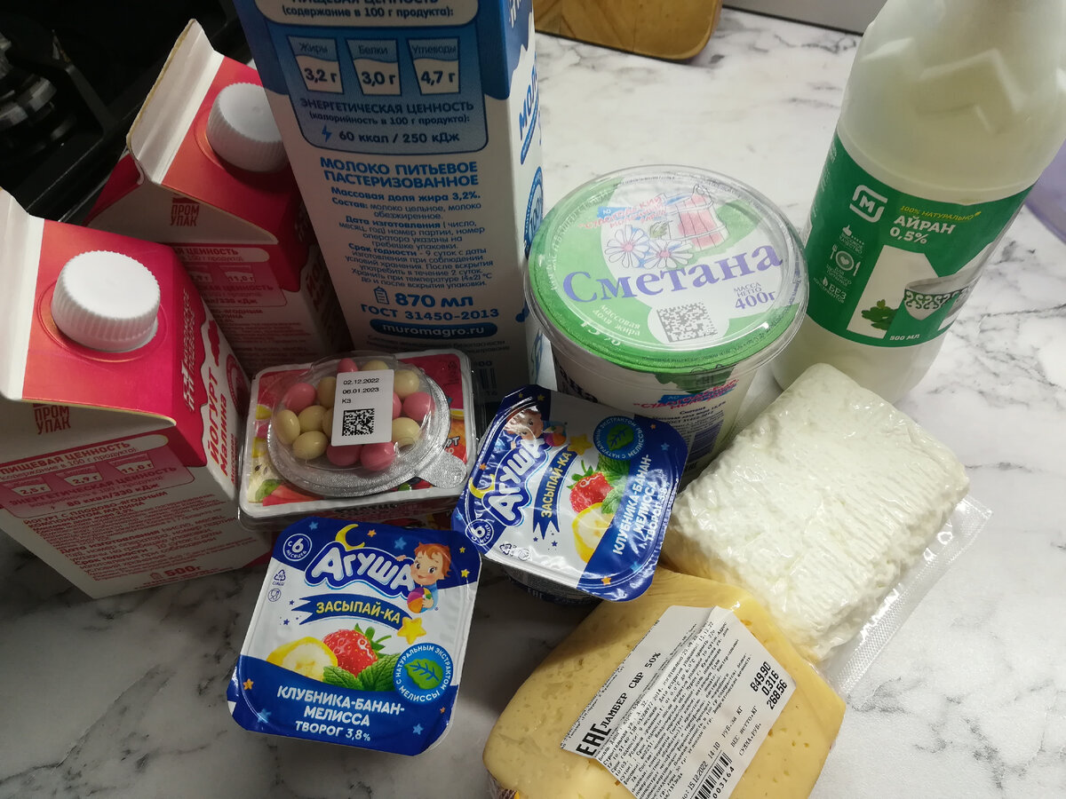 Первый поход в магазин обошёлся нам в 3200 руб. Купили молоко, йогурты, творог, сметану, сыр, айран, творожки,