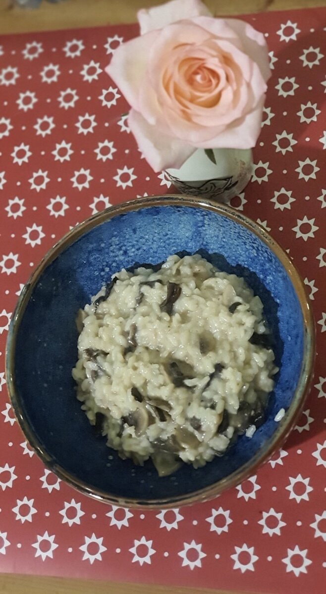 Замочить в холодной воде горсти две сушеных лесных грибов. Почистить и порезать одну луковицу. Обжарить лук в смеси растительного и сливочного масла. Добавить отжатые грибы. Слегка обжарить. Если кажется, что сухо, добавить ещё кусочек сливочного масла. Убавить на маленький огонь, закрыть сковороду крышкой, пусть томится. В это время моем шампиньоны - штук 8-9 среднего размера. Режем тонкими пластинками. Отправляем в сковородку. Увеличиваем огонь. Закрываем крышкой, не забываем перемешивать. Хорошо, если у вас специальный рис для ризотто хорошего качества, например, сорта арборио, карнароли, виалоне, бальдо, рома. Последний считается идеальным для приготовления ризотто, но нечасто встречается в российских магазинах. В этом случае рис не промывают водой, чтобы не смыть крахмал, придающий кремовую консистенцию ризотто. В моем случае всё было гораздо проще. Был только круглозёрный рис, который продавался на развес. На мой взгляд, он г