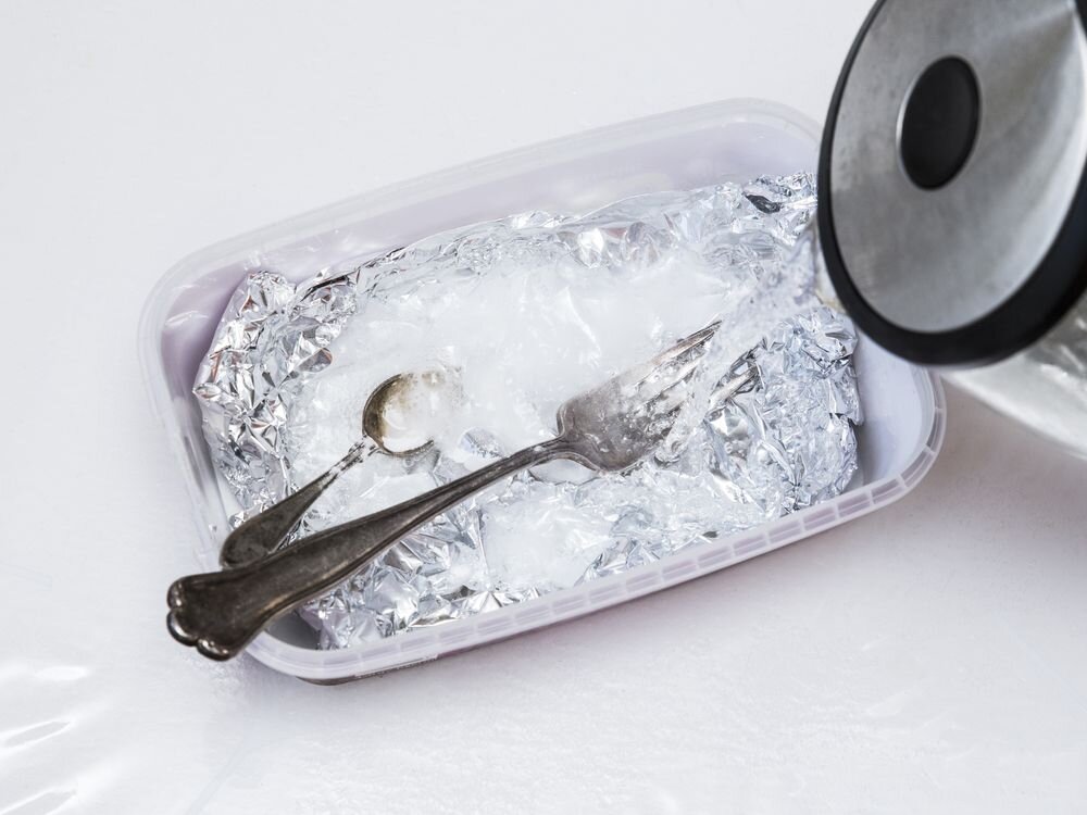 Можно использовать одноразовый алюминиевый лоток для запекания или выстелить стеклянный лоток фольгой. Положите приборы в лоток и посыпьте сверху пищевой содой. Точное количество соды не имеет значения, главное насыпать так, чтобы приборы были ей равномерно покрыты. Затем влейте в лоток кипяток. Приборы должны быть полностью покрыты водой.