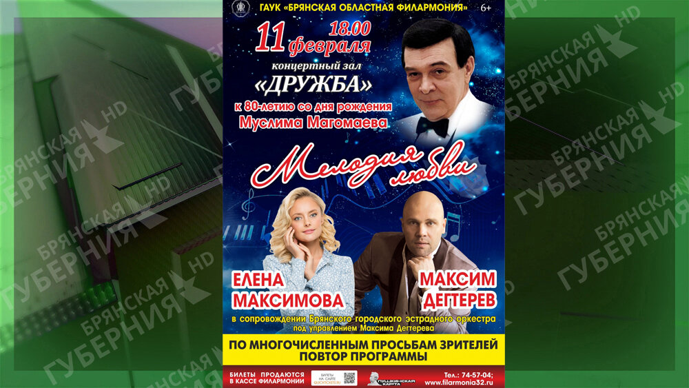 На сцене Брянской областной филармонии состоится концерт «Мелодия любви», посвящённый 80-летию со дня рождения прославленного эстрадного и оперного певца и композитора – Муслима Магомаева. Мероприятие пройдет 11 февраля в 18 часов. В концерте прозвучат всеми любимые песни в исполнении певца и композитора Максима Дегтерева и финалистки телепроекта «Голос», победительницы проектов «Точь-в-точь» и «Три аккорда» певицы Елены Максимовой в сопровождении Брянского городского эстрадного оркестра под управлением Максима Дегтерева. 6+ ФОТО: Брянская областная филармония В Брянске состоится концерт «Мелодия любви»