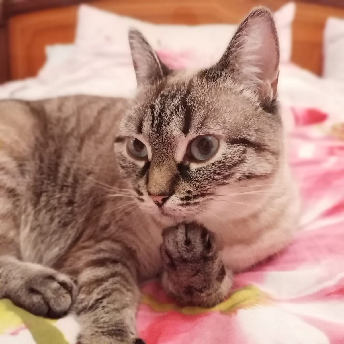Мишель живет с одной почкой. Вводное классическое: порода не гарантия хорошей судьбы. Молодая чистопородная тайка табби-пойнт оказалась у хозяев с алкогольной зависимостью. Кто знает, как это вышло: не была продана из клуба, бросили ли ее богачси как надоевшую игрушку... Жилось таечке откровенно скверно. Её поколачивали, выгоняли в подьезд. От ударов разрыв брюшины - образовалась грыжа. Отбили почку. Когда кошку забрали, грыжу ушили сразу, пока не началось ее ущемление опасное для жизни. А на УЗИ ждал сюрприз... Первое УЗИ показало, что правая почка полностью атрофирована, последующие - что она продолжает усыхать. За год от почки остался только мочеточник.