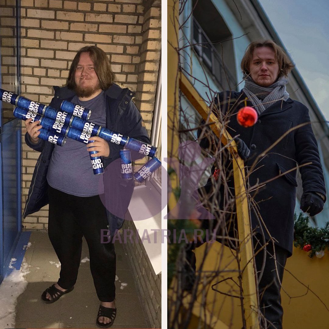 "У меня сегодня годовщина со дня операции. Начальный вес 158, сегодня взвесился 86. Фотографии до и после, всё как полагается, прикрепил :). Фото до в полный рост с банками пива хорошо резюмирует мой образ жизни до операции!