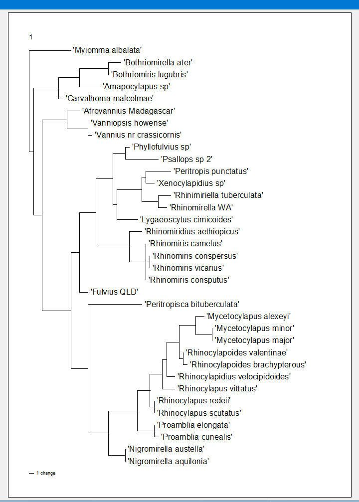 И вот я подошла к тому, ради чего вообще стала писать про PAUP - это successive weighting. Что такое взвешивание признаков и чем отличается априорное от апостериорного взвешивания, и для чего они нужны, я уже объясняла ранее. Successive weighting - это один из способов применить апостериорное взвешивание, то есть понять, насколько получившееся дерево стабильно и согласованы ли признаки. Про другой вариант апостериорного взвешивания, implied weigthing, я тоже уже написала ранее. Чтобы посчитать successive weighting, надо сначала провести парсимониальный анализ в PAUP, про это можно почитать здесь и здесь. У меня получилось вот такое вот строго согласованное дерево. Далее в главном меню выбираем Data, и в выпадающем меню Reweight Characters. Появляется вот такое окно с опциями. Здесь лучше оставить перевзвешивание на основе rescaled consistency index. Веса признаков будут назначаться на основе пересчитанного consistency indeх, в соответствии с тем, сколько раз признаки появляются