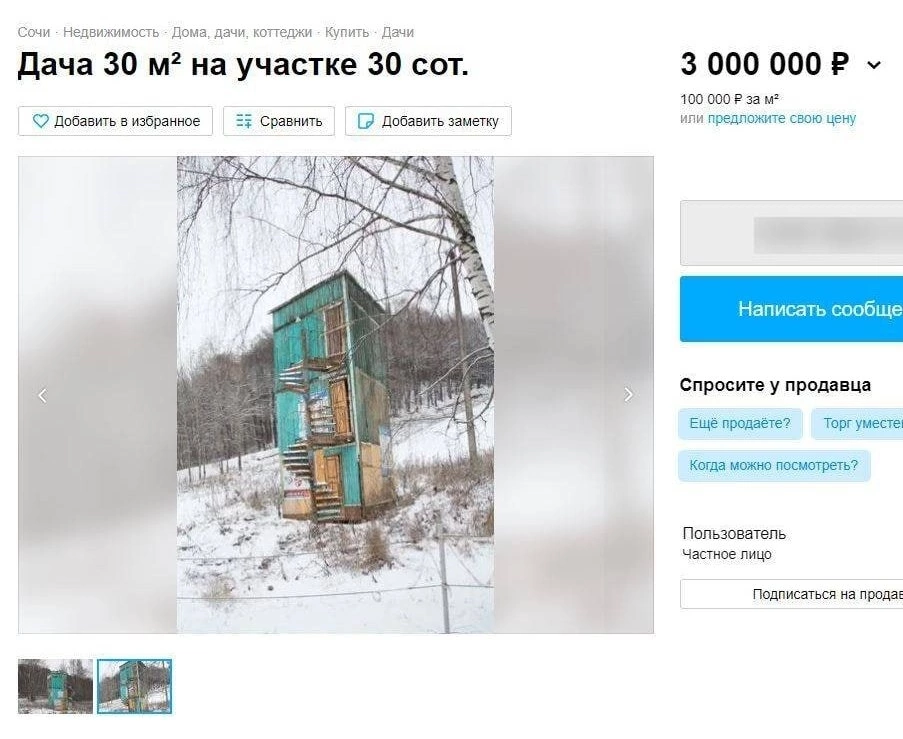 Владелец трёхэтажного домика с винтовой лестницей Кирилл А. рассказал, что снижать цену не планирует и лучше отдаст здание под благотворительность. «Внутри дома ремонта в стиле лофт. Санузел для любителей отдыха на природе. Есть несколько человек, который проявляют интерес, но, к сожалению, слишком вялый. А цена такая, потому что я достаточно здраво осознаю "состояние" дома. Но торга не будет никакого. Я лучше отдам просто под благотворительность тогда». Необычная дача расположилась на участке в 30 соток на Красной Поляне. Владелец отмечает, что ремонт в доме – дизайнерский, а материалы стен – экспериментальные. В сети дачу уже сравнили с волшебным домиком семьи Уизли из саги про Гарри Поттера.
