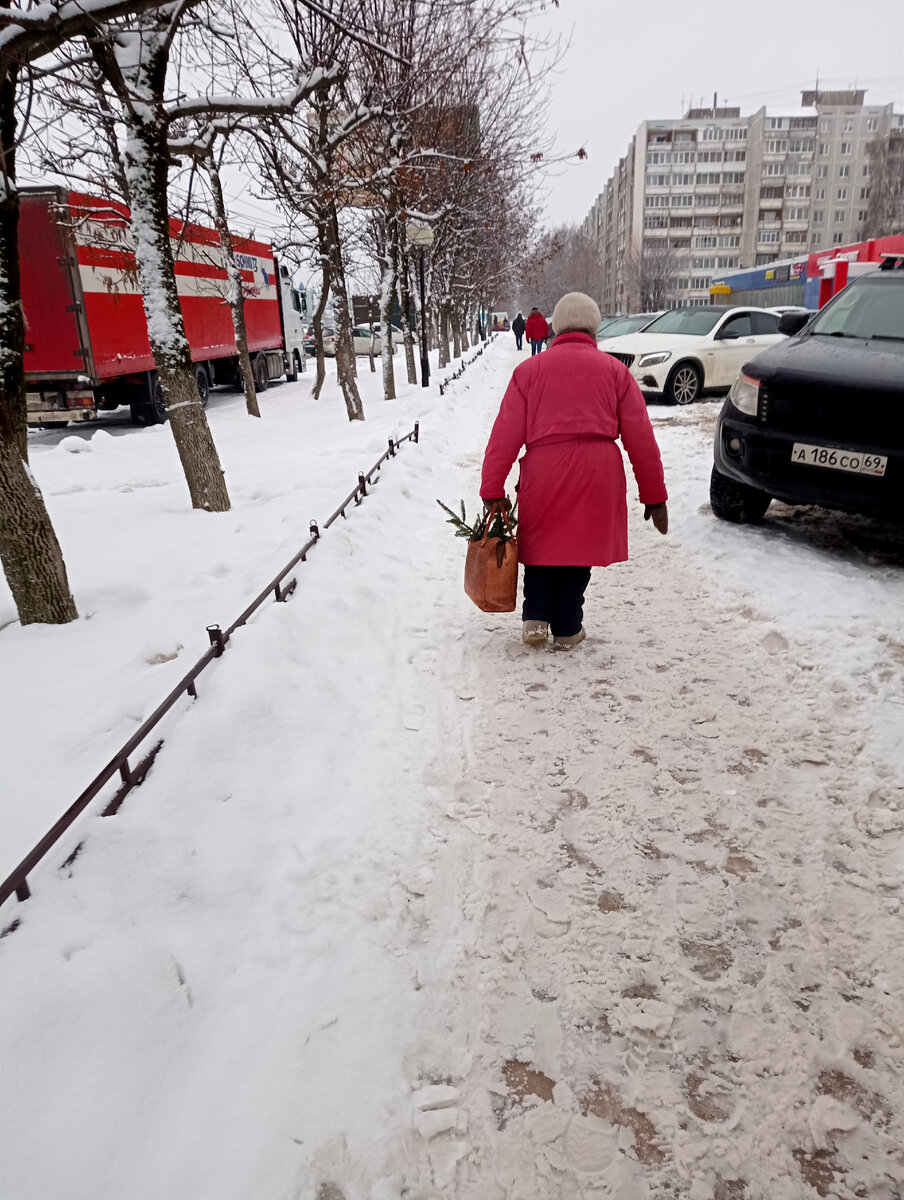 "Встречайте новый год во всеоружии!", - обычно призывает глянец накануне праздника. И томные красотки загадочно улыбаются. Удивительно, но и в этом особенном году оборот активно используется. Свежо, конечно, звучит. Но красотки всё равно улыбаются. Вооружились. На ветке висит потерянная варежка. Её подвесили так, что снег падает прямо в неё. Доверху! К весне просохнет, ничего. Забавно, что год назад я потеряла свою варежку ровно на этом же месте. Но успела вернуться (они мягонькие были, добрые) и найти её на дороге. Обнаружен Бермудский варежкин треугольник. Женщина несёт ёлку с себя ростом. Обняла её и еле тащит. Еле тащит ель, да. Новая, дурацкая скороговорка возникает внезапно: поела ли Ева, что ель тащит еле... Зачем я это придумала? Прости, мироздание! Как же ты замусорено нами! ☺ Иду за пожилой дамой с сумкой, почти такой, как у моей бабушки. Раньше модные были такие со слонами, - наверное, с Индией тогда задружили. Невозможно крепкая сумка. Мама с ней ходила, потом бабушка