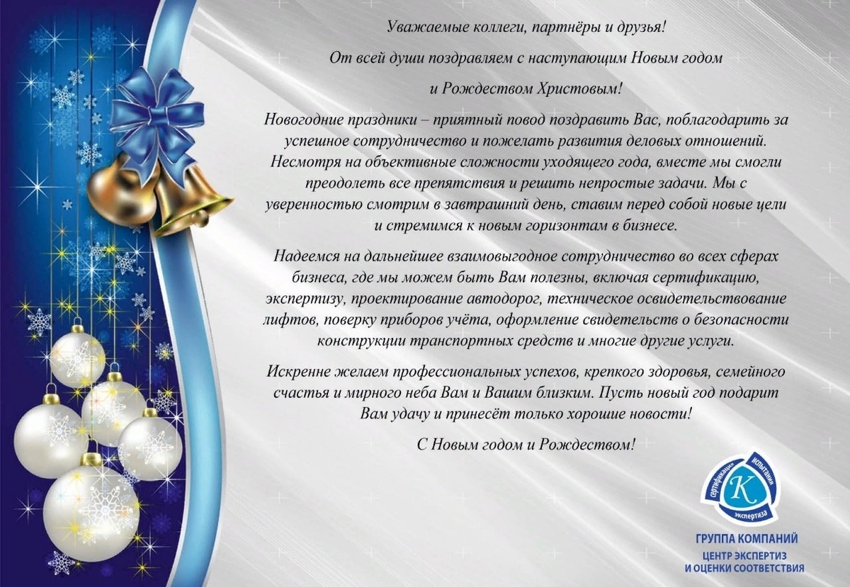 Время неумолимо стремится вперед. День за днем мысленно отрываешь листки календаря, и так совсем незаметно приходит Новый год. Этот волшебный праздник всегда радует, приносит новые ожидания и заставляет подвести некоторые итоги, задуматься о том, все ли поставленные задачи выполнены. Новогодние праздники – это приятный повод поздравить своих коллег и партнеров, поблагодарить за успешное сотрудничество и пожелать развития деловых отношений.