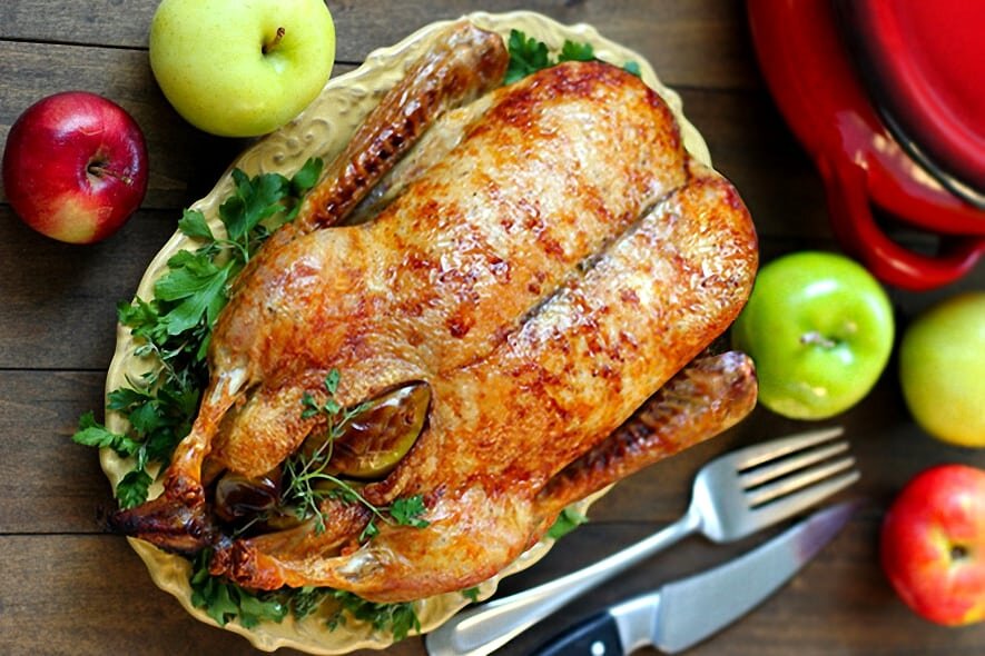 Очистить как следует молодую утку, потом очистить и изшинковать мелко хорошего вкуса яблоки, сложить в кастрюлю, прибавить немного масла и запассеровать. Когда вполовину будет готово, прибавить вишен без косточек и, размешав, поставить на лед. Между тем, истолочь в ступке вишневые косточки, сложить в кастрюлю, прибавить немного кардамону и корицы, налить отстоявшимся из яблок соком или водою и закипятить на легком огне под крышкою. Когда яблоки простынут, процедить этот отвар сквозь частое сито и, размешав с яблоками, нафаршировать назначенную для жаркого утку, потом заправить нитками, сложить на сотейник, облить маслом и поставить в горячую печку. Когда обжарятся немного, вынуть, полить собственным соком и продолжать так, пока утка изжарится до готовности. Перед отпуском снять на блюдо, выбрать нитки, а в сотейник прибавить бульону, выварить сок, процедить сквозь сито и сняв жир, подлить под утку. Похожие рецепты: Утка жареная, фаршированная лапшой с грибами Утка с гриба