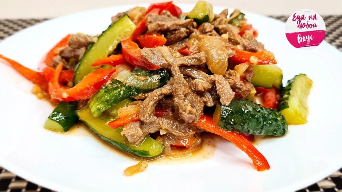Салат, который просто не может надоесть! Очень вкусный и всегда актуальный, хоть на праздничном столе, хоть на семейном ужине. Салат из огурцов и говядины (хотите по-корейски, а может и по-китайски) сочный, яркий, сытный и совсем без майонеза. Готовится просто, а получается всегда "пальчики оближешь"! Ингредиенты в штуках можете найти ниже, рядом граммами. Готовьте с удовольствием! Вкусный и сочный корейский салат из говядины с огурцами. Пошаговый рецепт 1. Огурцы помоем и, отрезая концы, разрезаем пополам поперек, берем огурцы среднего размера. Каждую половину режем вдоль, а затем на три брусочка, таким образом, у нас получаются нарезанные кусочки около 4-5 см. Обильно солим их в миске, слегка смешаем и оставим до выделения сока (почти вся соль потом уйдет с соком, не бойтесь пересолить). 2. Говядину для салата лучше слегка подморозить, так удобнее резать тонко. Нарезаем воль волокон, если можно выразиться, тонкой соломкой. Обжариваем мясо на сильно разогретом масле (30 мл), перемешае