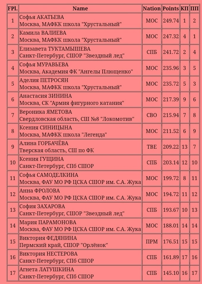 Завершился главный и самый важный российский турнир по фигурному катанию. По результатам двух программ итоговая турнирная таблица выглядит следующим образом! Софья Акатьева стала Чемпионкой России 2023 года. Показалось, что фигуристка сильно волновалась перед прокатом. Упала с тройного акселя, успешно приземлила два четверных тулупа. Остальные прыжки невероятной красоты и очень уверенные. Классная Соня, оправдывает свое милое прозвище Супер Соник.Первая большая победа по взрослым! 249.74 Камила Валиева восстановила свой шикарный четверной прыжок.Сегодня ей покорились аж два четверных тулупа, очень зрелищных и мощных. Была одна помарочка: вместо тройного флипа получился двойной. В остальном, прекрасная Камила. Невероятная фигуристка, уникальное сочетание сложных прыжков и грации. Растрогала даже своего тренера Этери Тутберидзе, которая славится своей невозмутимостью. 247.32, второе место. Елизавета Туктамышева. 15-й чемпионат страны в карьере Лизы. Какая длинная, сложная и интересная