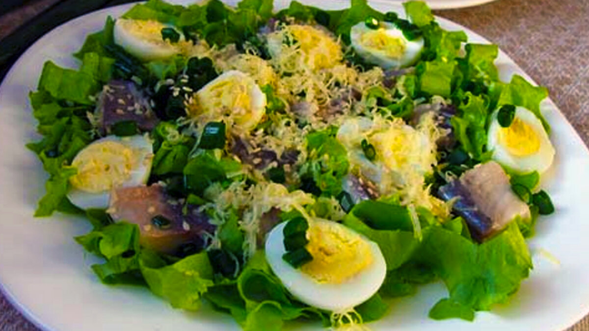 Нам понадобятся следующие ингредиенты: Приготовление: Перепелиные яйца отварить, очистить и разрезать вдоль на 2 части (если вы не знаете, сколько минут варятся перепелиные яйца, то ориентируйтесь на 2-3 минуты в кипящей воде). Салат порезать и положить на дно тарелки. Сверху положить нарезанное кусочками филе сельди, перепелиные яйца. Сбрызнуть салат из сельди соком лимона. Сверху посыпать мелко нарезанным луком, натертым на мелкой терке сыром и кунжутом.