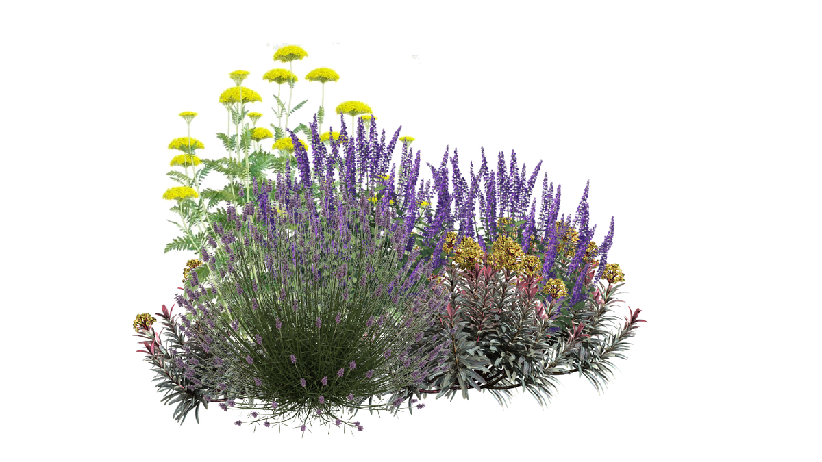 Наслаждаюсь. Отдыхаю. Радуюсь. Даю свободу фантазии и рукам, придумывая яркие композиции и сочетания. Вот здесь мое любимое сочетание "желтый и синий". Самый высокий на эскизе —тысячелистник таволговый. Для небольшой клумбы хватит одного куста. И необязательно таволговый. Есть и другие виды желтых тысячелистников. На втором плане шалфей дубравный. Я б его впихнула в любую клумбу —так люблю! Растение с пестрой листвой и желто-оранжевыми соцветиями —молочай. Здесь два варианта. Либо многоцветковый Bonfire, либо миндалевидный Red Velvet или Purpurea. Оба с листьями красноватого оттенка, оба с неяркими желтоватыми соцветиями. Не знаю, какой бы выбрала. Оба хороши. На переднем плане лаванда. Хотя, если поиграться, можно на передний план и молочай выставить. Кому нужно все и в одном месте — вот здесь есть: шалфей, молочай, тысячелистник, лаванда. Клумба в розовом — это гаура, кетрантус и хаконехлоя. Все три отлично выдерживают полное солнце, но чтобы добиться от гауры вот такой формы