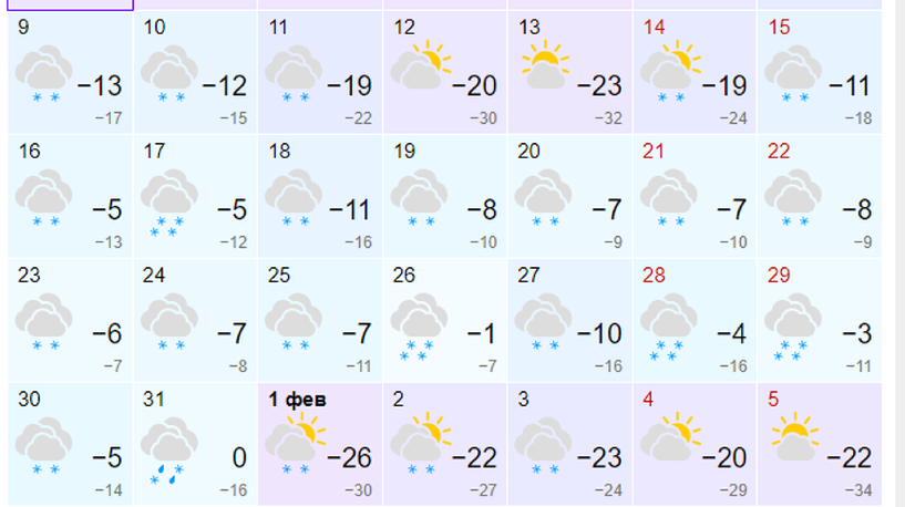 Новый год встретит новосибирцев переменчивой погодой. Согласно сервису Gismeteo, начало января ожидается морозным. 3 числа ночная температура дойдёт до отметки -38 градусов. Днём столбик термометра в первую неделю покажет, в среднем -24. С 8 по 10 января ожидается небольшое потепление до -12 градусов в светлое время суток и снегопад. Позже снова наступит похолодание, переменная облачность. С 15 января дневная температура составит -5…-11 градусов, ночью столбик термометра опустится на 2–3 градуса ниже. 31 января синоптики прогнозируют максимальное потепление за месяц. Днём воздух прогреется до нуля градусов, пройдёт снег с дождём, на небе — пасмурно. Специалисты сервиса «Яндекс. Погода» обещают новосибирцам морозы и солнце в начале 2023 года. 8 января метеорологи прогнозируют потепление до -4 градусов в светлое время суток. 17 января город вновь накроют холода. Ночью ожидается -32 градуса, днём -24…-27. В середине месяца несколько раз пройдёт снег, на небе — переменная облачность. Конец