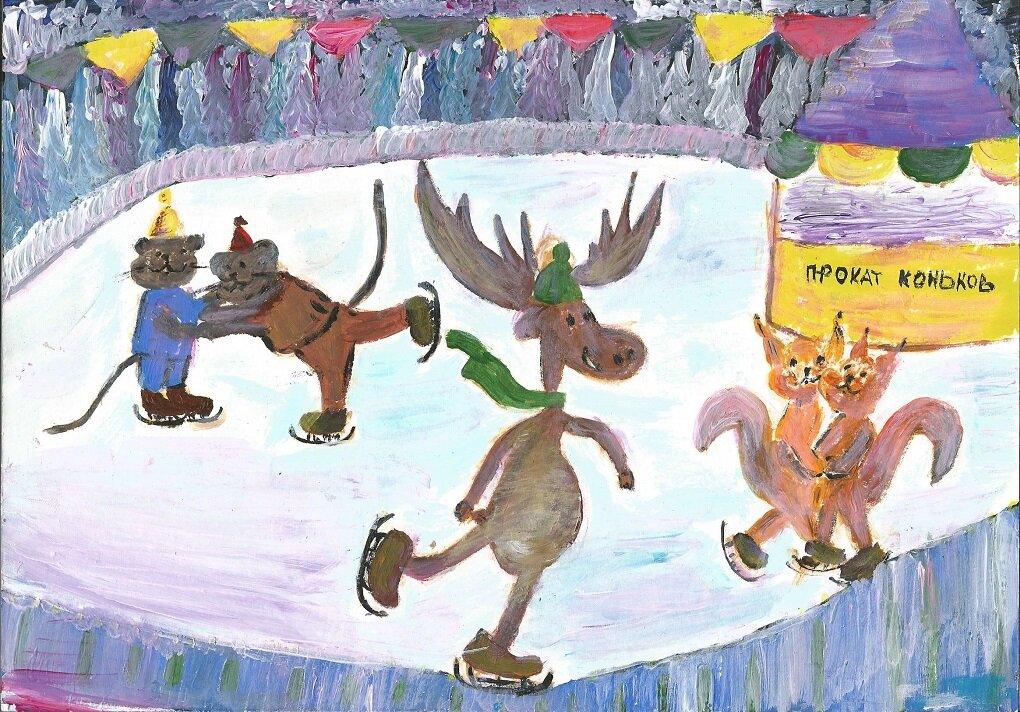 Лиса в красивом розовом костюме и розовых коньках скользила по льду, распушив хвост. За, ней, взявшись за руки, не спеша ехали два бельчонка, весело болтая.