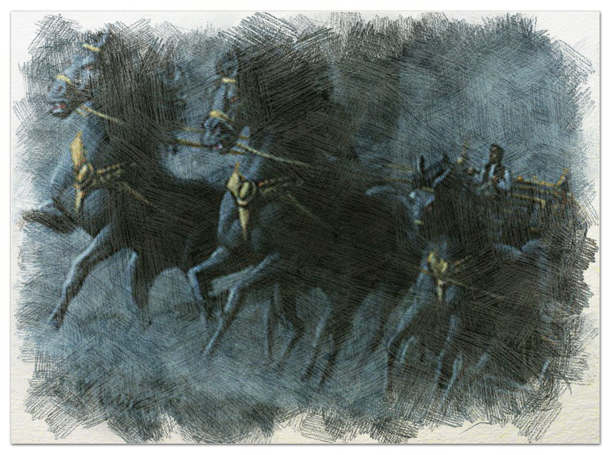 Откуда-то издалека, слышит топот копыт и колокольчик. Дёрнулся. Проснулся. Топот приближается всё ближе и ближе. Уже слышен храп коней.
