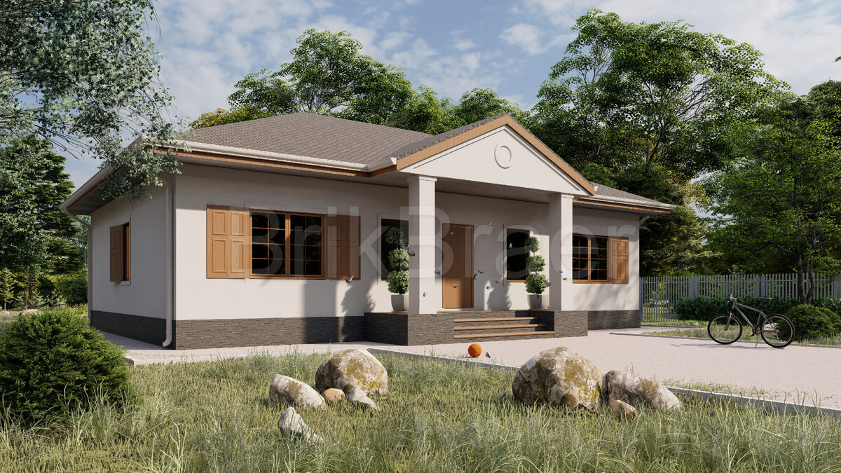 Проект Дома №158 своим внешним видом вызывает тёплые эмоции: эстетичная арка на входе в Дом, окна с деревянными ставнями, красивая четырёхскатная кровля