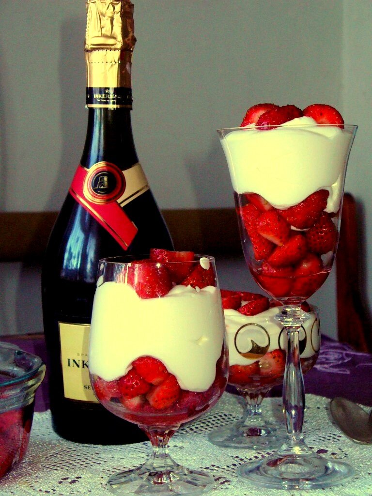 Десерты в бокале - выглядят празднично, вкусны, готовить просто, масса вариантов приготовления. Сегодня я выбрала клубничный десерт. Можно готовить с любыми ягодами, с хурмой, с бананом, с киви и так далее. * 300 гр свежей клубники, 200 гр сливок ( 20 % жирности), 2 ст ложки домашнего крем - сыра, 1 ст ложка сахара, 1.5 ст ложки сахарной пудры. * Клубнику вымыть, обсушить, удалить плодоножку и разрезать ягоды попалам. Сложить в миску и посыпать сахарным песком. Охлажденные сливки взбить миксером, с сахарной пудрой. Добавить крем - сыр и взбить, до получения однородной, пышной массы. В бокал выложить клубнику и взбитые сливки. Всё, готов нежнейший десерт, который тает во рту) ** Как готовить крем сыр я уже писала, сейчас повторюсь - * Нужно - 0.5 литра сметаны 15% жирности, 0.5 литра кефира 2.5% жирности, 0.5 литра ряженки 4% жирности. Все эти продукты я беру местного молочного завода. Все составляющие вылить в кастрюльку и тщательно перемешать ложкой. Можно добавить пол