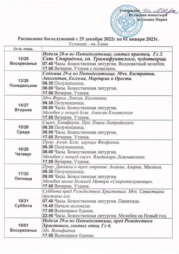 25.12.-01.01. Расписание богослужений в Введенском женском монастыре города Иваново