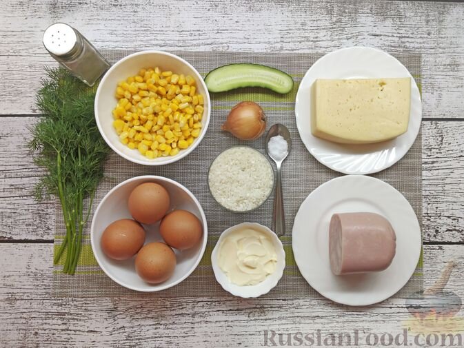ПРОДУКТЫ, КОТОРЫЕ ПОНАДОБЯТСЯ Ветчина - 200 г Рис - 160 г Кукуруза консервированная - 150 г Яйца - 4 шт Лук репчатый - 60 г Огурец - 30 г Укроп свежий - 1 пучок (15 г) Майонез - 80 г Соль - 1/2 ч. ложки Перец чёрный молотый - 1 щепотка* Для украшения: Сыр твёрдый - 300 г Ветчина - 60 г Маслины без косточек - 1 шт Зелень свежая - несколько веточек Морковь - несколько ломтиков --ПРИГОТОВЛЕНИЕ-- Подготовить продукты: Рис промыть до прозрачной воды, 4-5 раз. Выложить рис в кастрюлю и залить водой из расчёта 1:2 (на одну часть риса две части воды). Отправить кастрюлю на плиту. Довести до кипения. После закипания уменьшить огонь до минимума, посолить и варить рис до готовности - до впитывания жидкости, около 15 минут. Готовому рису дать немного остыть. Яйца отварить вкрутую в течение 10 минут после закипания. Остудить в холодной воде. Варёные яйца очистить от скорлупы и натереть на крупной тёрке. Ветчину нарезать некрупными кубиками.