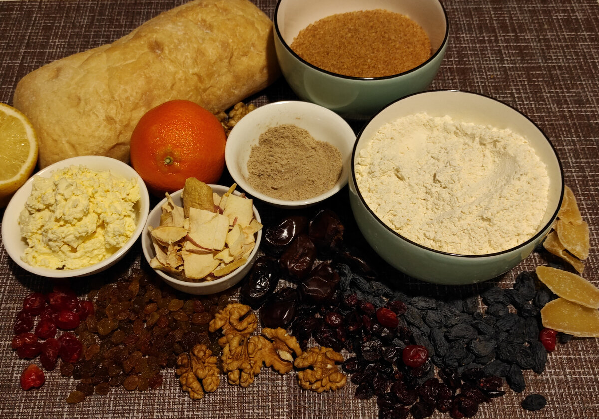 Смешиваем вместе все наши ингредиенты - муку, специи, сухофрукты, сливочное масло, молоко и 1 крупное яйцо. 3/4 чиабатты перемалываем в крошку, так же поступаем с орехами, и добавляем в миску. Так же добавляем сок и цедру одного апельсина, половинки лимона и 2 ст. л. бренди.