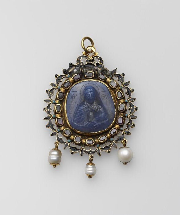 Хороший пример того, когда и у старых мастеров руки откуда надо росли, и продолжатели дела не подкачали. В XII веке, в Константинополе мастер сделал камею «Богоматерь с младенцем». Потом она долгое время путешествовала по свету, меняла хозяев. Но не затерялась, не оказалась в каком-нибудь кладе или сокровищнице, а попала в Москву. Тут во второй половине XVII при Алексее Михайловиче из этой камеи решили сделать панагию – небольшую иконку. А так как заказ был, вполне возможно, что царский, то мастера расстарались и сделали оправу из золота с использованием жемчуга и драгоценных камней. Вот и получился очень красивый предмет, который попал в царскую сокровищницу и теперь тоже хранится в музее. Размер этой миниатюрной работы всего навсего 4,8 на 4 сантиметра. Представляете, насколько это была кропотливая и тонкая работа! И насколько красиво все получилось!