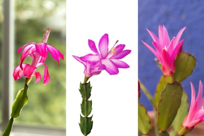 Чтобы помочь с идентификацией праздничного кактуса, сравните формы цветов на приведенном выше изображении (слева направо: Рождественский, благодарственный и пасхальный кактусы).