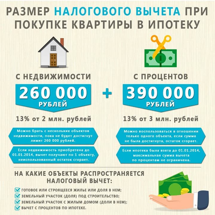 По закону после приобретения недвижимости россияне вправе получить налоговый вычет до 260 000 рублей и дополнительно вернуть налог с процентов по ипотеке — до 390 000 рублей. Эти деньги доступны всем трудоустроенным гражданам, плательщикам НДФЛ. Что такое имущественный налоговый вычет? При покупке жилой недвижимости гражданину предоставляется возможность вернуть сумму налогового вычета. Его размер — 13% от стоимости жилья. Вычет возможен от суммы до 2 000 000 рублей. Соответственно, максимально государство возвращает 260 000 рублей. Если вы купили квартиру за 5 000 000 рублей, то вернете в любом случае не более 260 000 рублей.